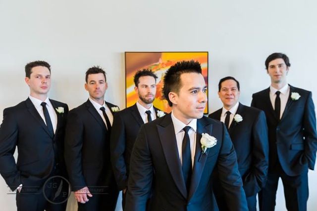 Stephen Neale (2000) married Sarah Orifici at St Benedict’s Catholic Church, Ardross, on Saturday 12 December. It was a 40-degree day and with no air-conditioning in the limousine, the groomsman and best man had to cool off and dry off in the church before the arrival of the bride! Members of the Class of 2000 in the wedding party are pictured here with Stephen including best man Aaron Taylor (third from left) and Richard O’Sullivan (far right).